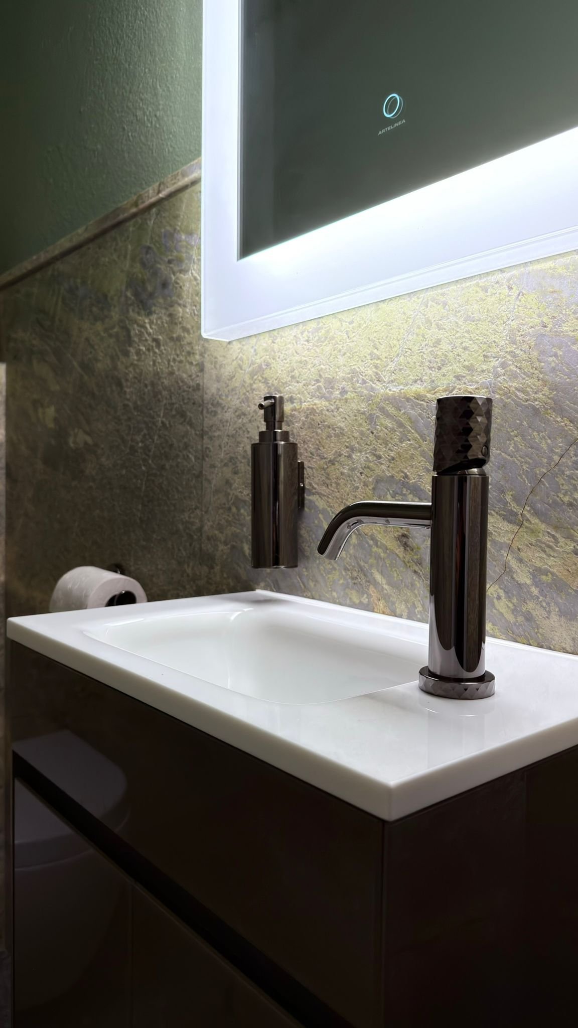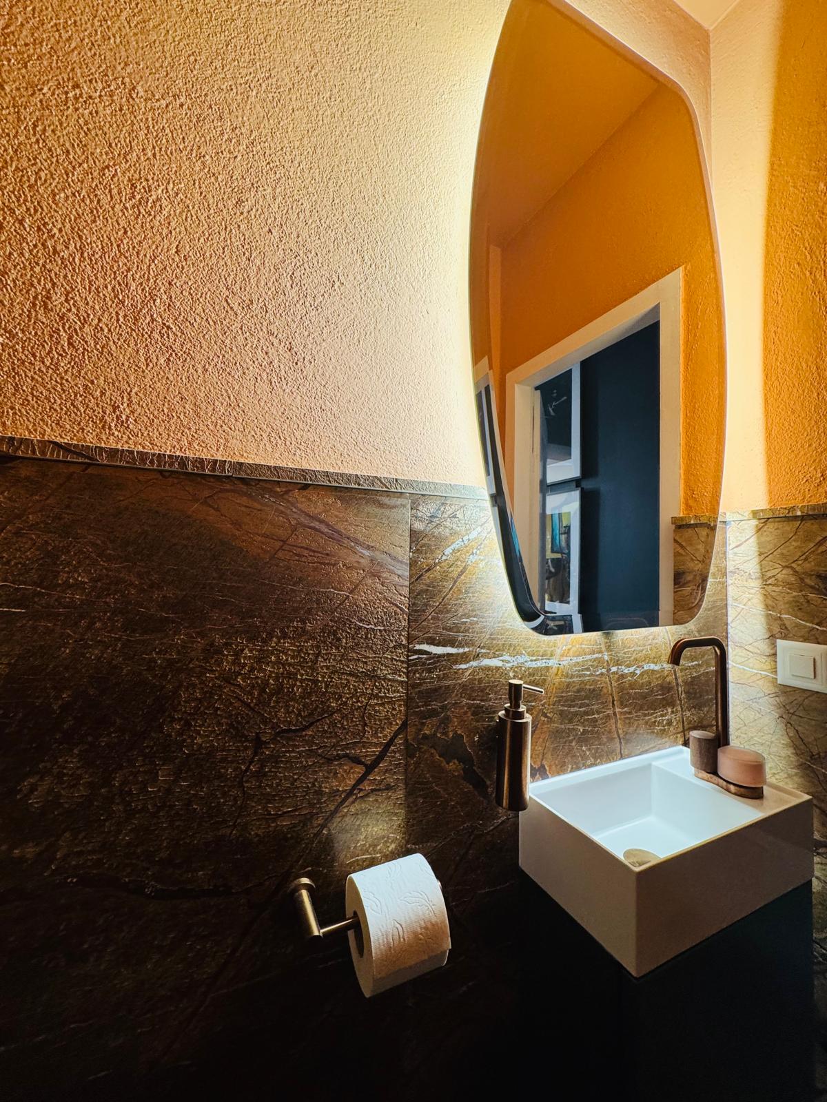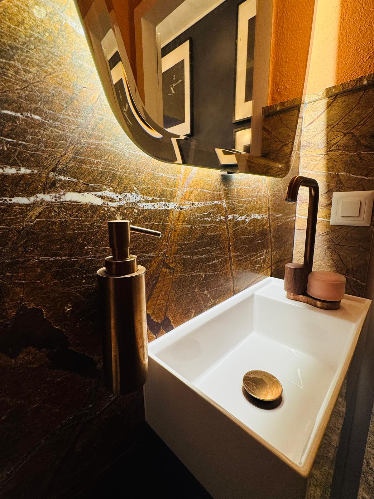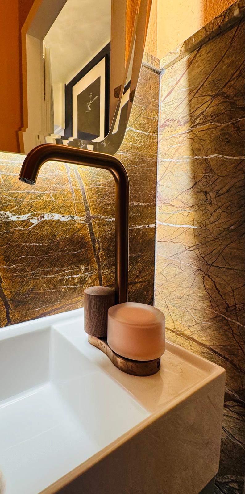 Un WC habillé de marbre Rain Forest brun, où les veinures organiques dessinent un paysage minéral. Une atmosphère chaleureuse et intime s’en dégage, comme un refuge sculpté dans la nature.