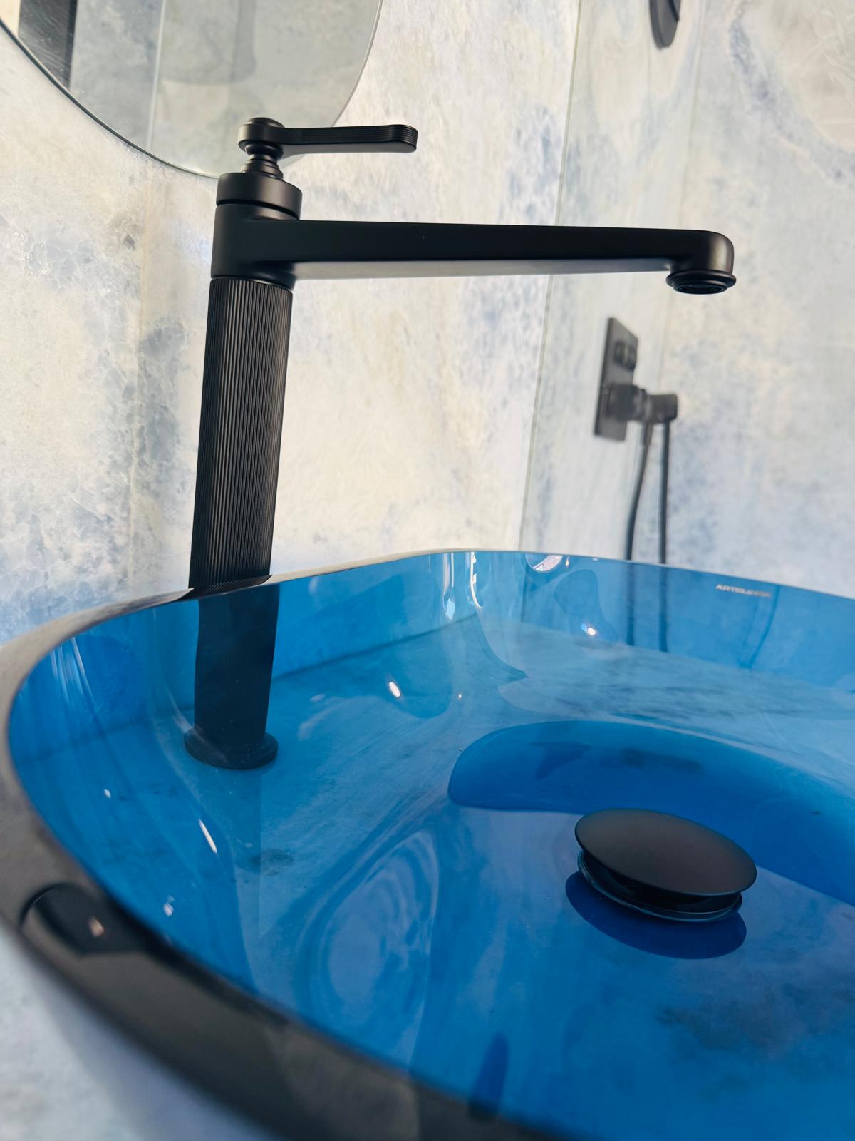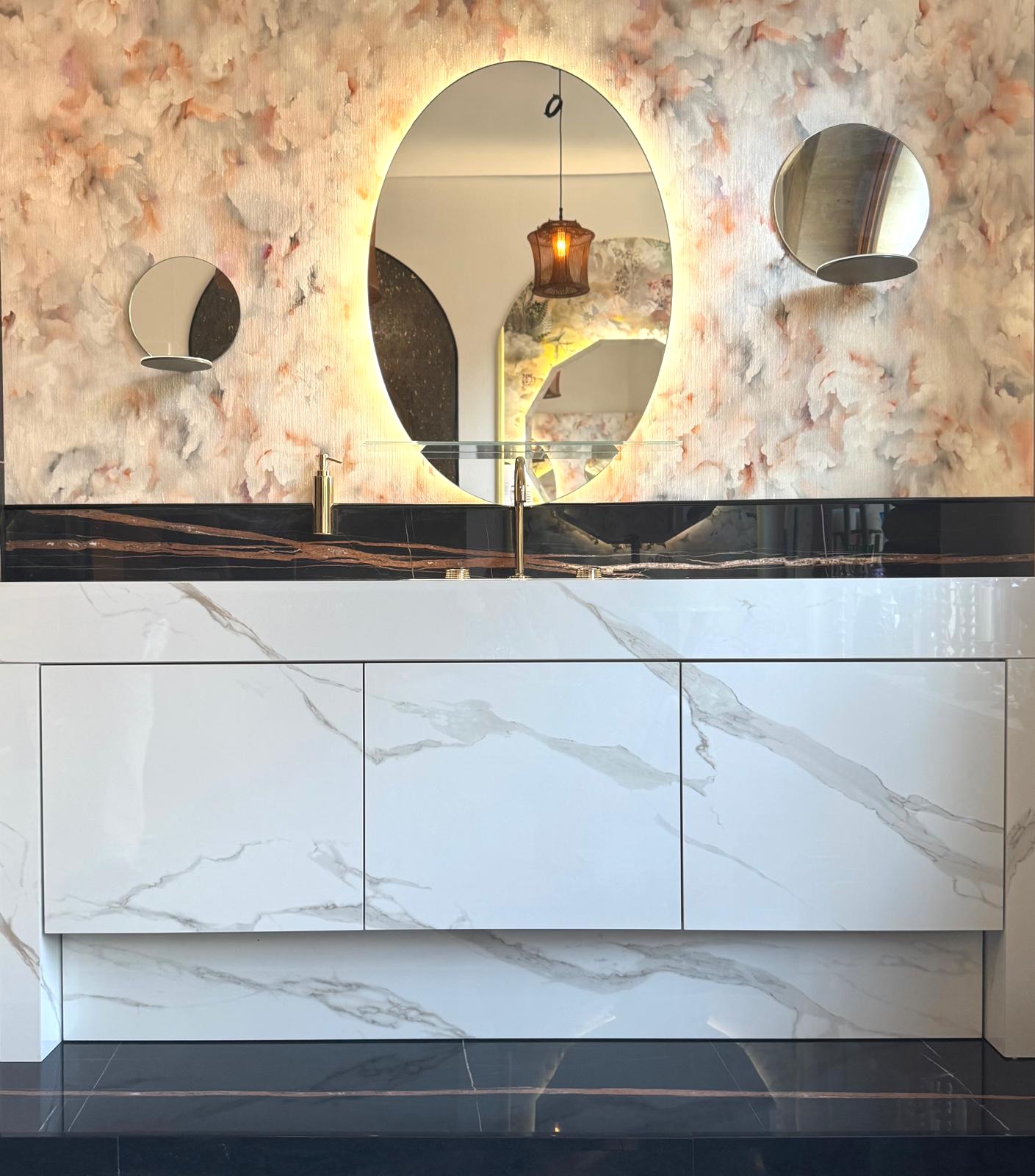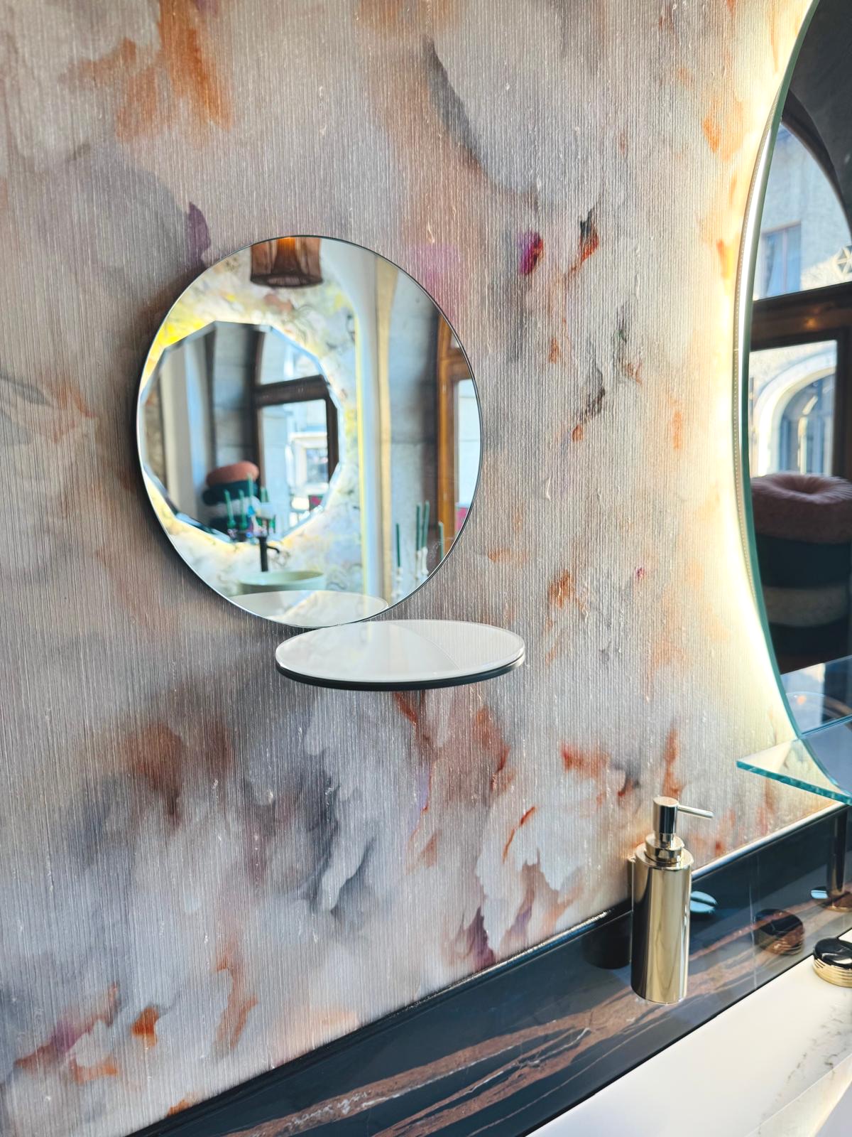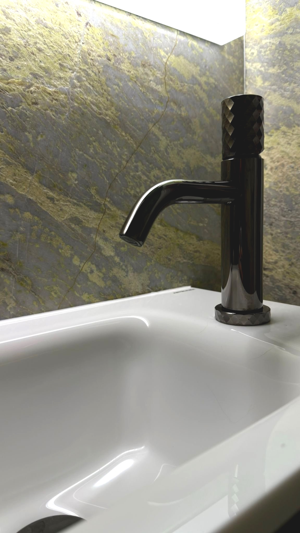 Un WC habillé de marbre Rain Forest brun, où les veinures organiques dessinent un paysage minéral. Une atmosphère chaleureuse et intime s’en dégage, comme un refuge sculpté dans la nature.