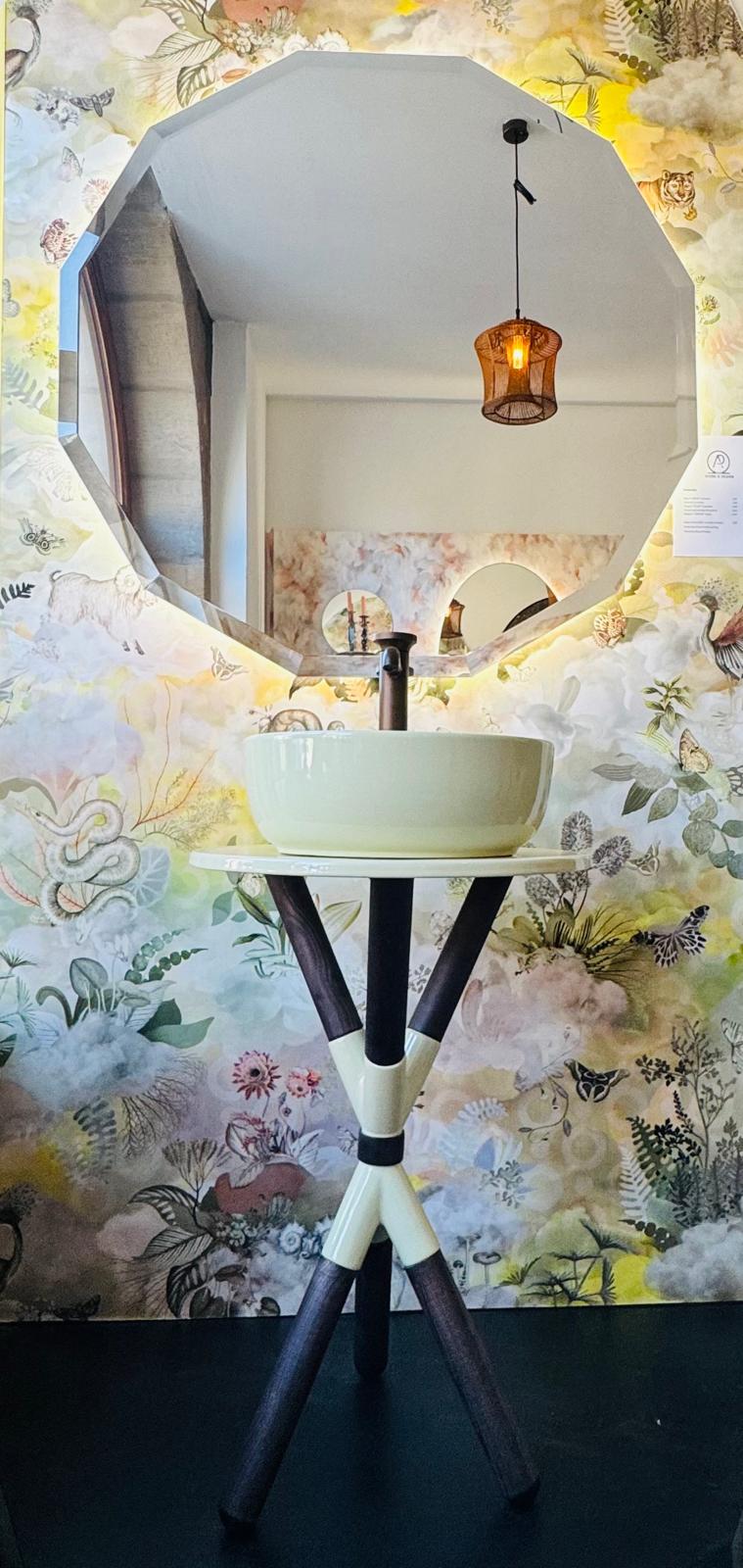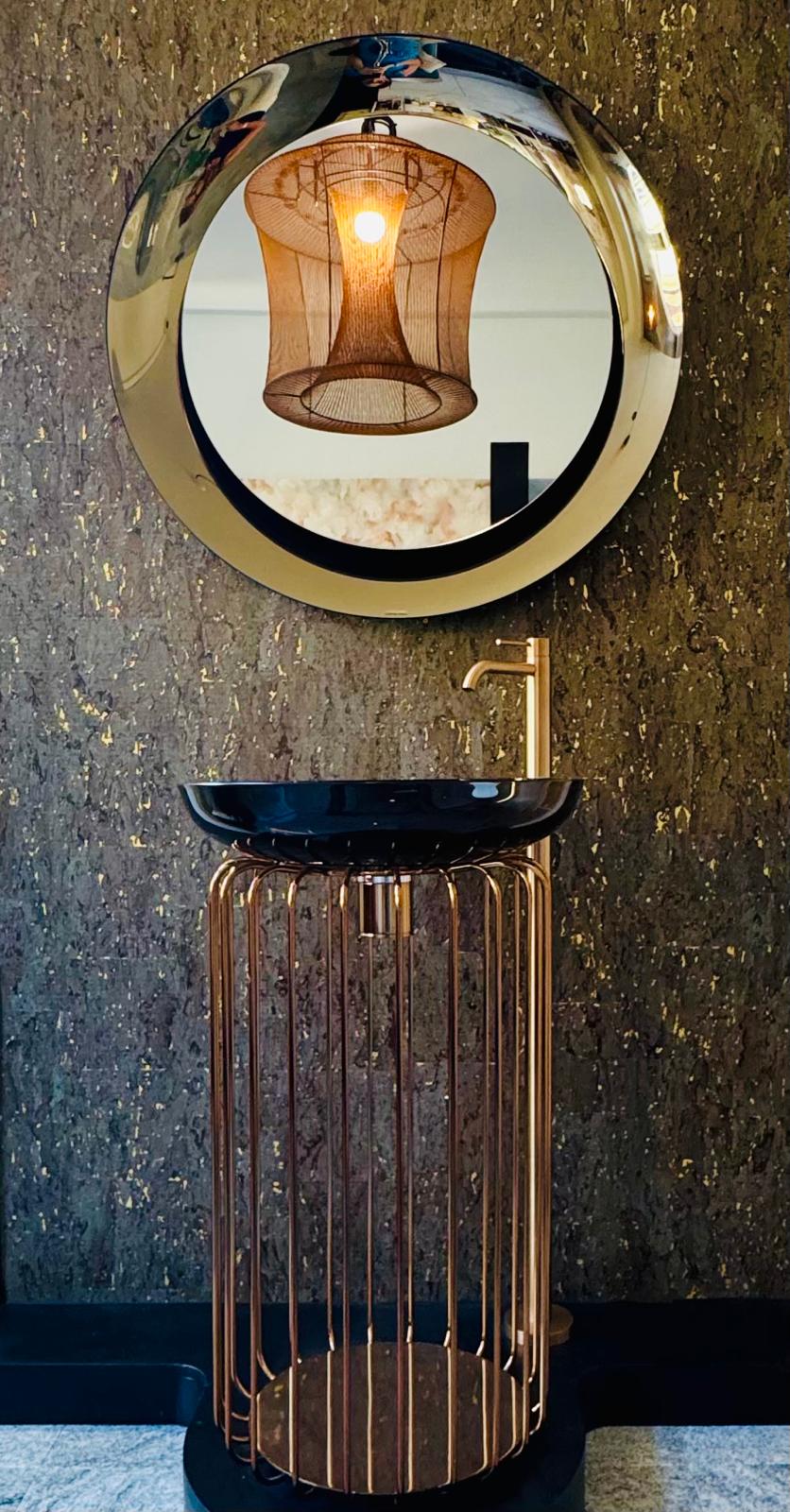 Collection mitigeur SO en bronze ambré avec une poignée en bois et une poignée en verre de couleur rose poudré.